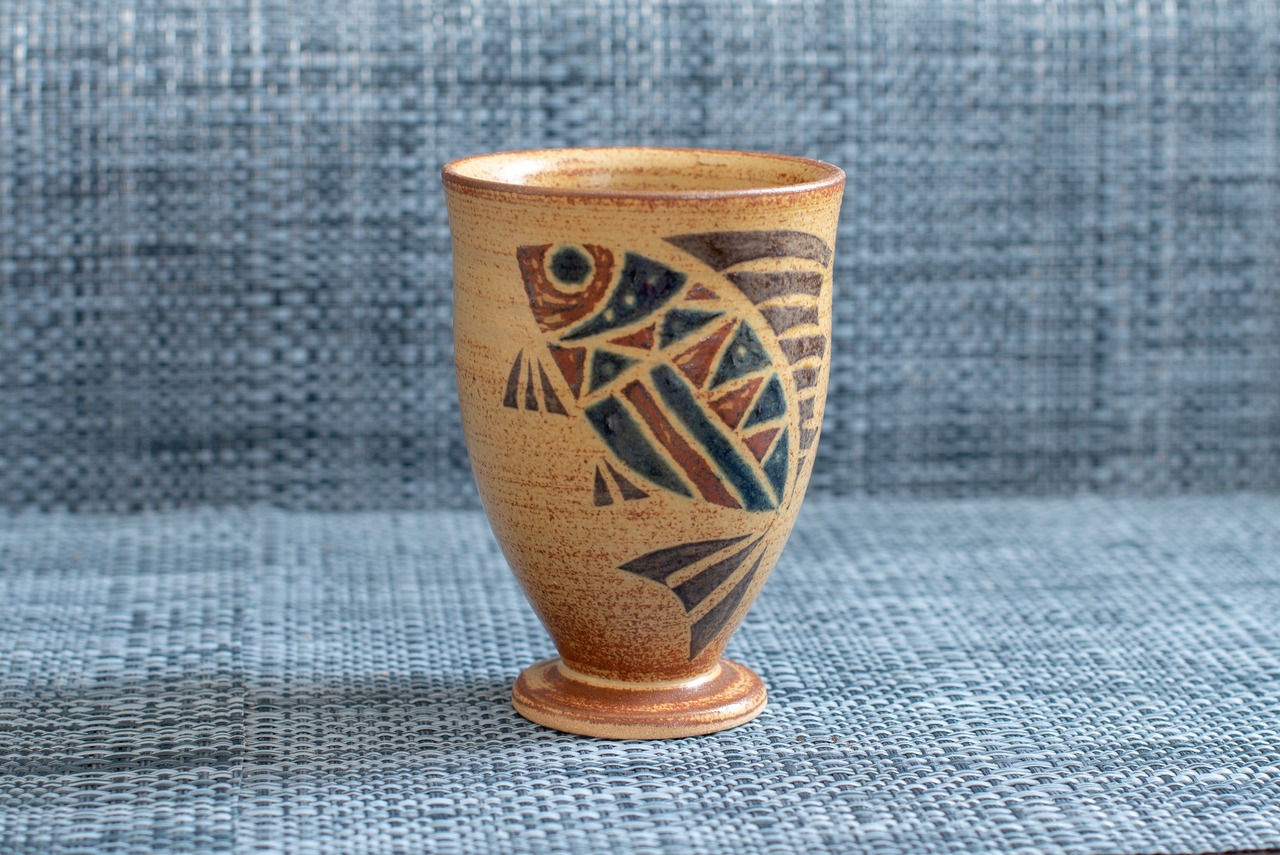 色合いは2種。茶系は、赤土を含めて色合いを出し土味を活かしながら魚の絵柄を入れ焼き上げました。